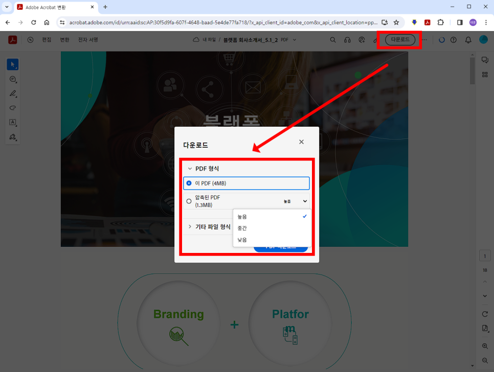 이제 PPT PDF 변환을 하기 위해 오른쪽 위에 있는 '다운로드' 누릅니다. 이어서 뜬 팝업에서 비압축, 압축(높음 / 중간 / 낮음) 옵션 중 하나를 선택할 수 있습니다.