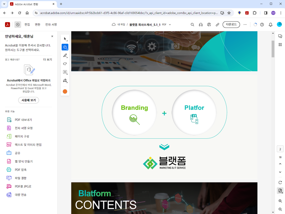업로드를 마치면 위 페이지를 볼 수 있습니다. 이곳에서 전자서명, 텍스트, 이미지 수정 / 추가 / 삭제, 페이지 결합 / 자르기 등의 편집 작업도 할 수 있습니다.