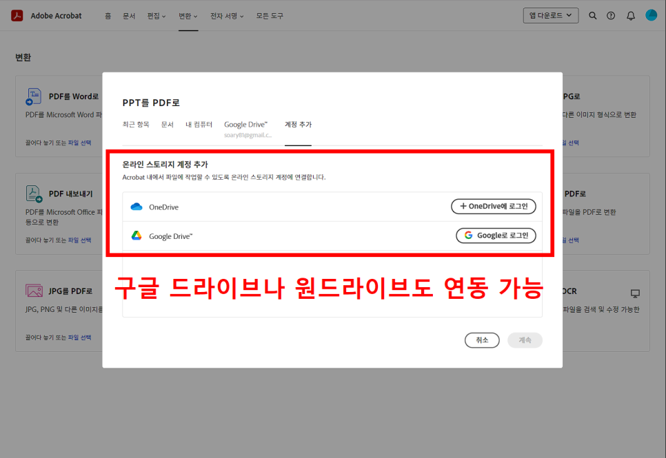 내 컴퓨터에 저장되어 있는 파일 말고도 크리에이티브 클라우드에 업로드한 파일, 원드라이브, 구글드라이브 등의 외부 클라우드 스토리지에 저장된 파일도 연동하여 사용하는 것도 가능합니다.