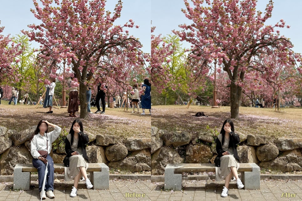 좌측이 최초 원본, 우측이 사진 사람 지우기, 사진 배경 흐리게 만들기 방법을 활용하여 포토샵 보정한 사진입니다. 딱 봐도 느낌이 다르죠?