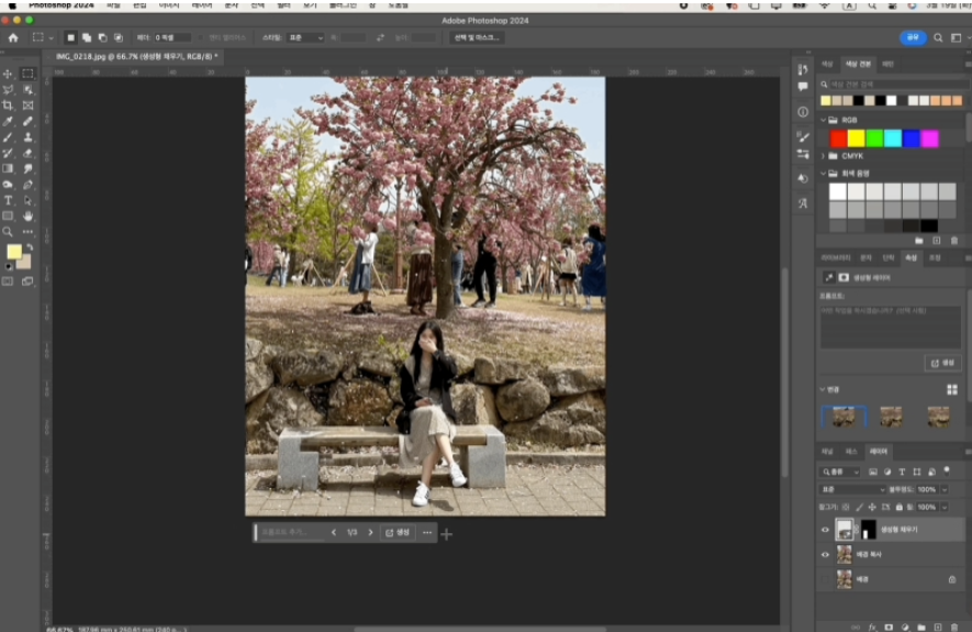 그러면 방금 전까지 옆에 있었던 인물이 깔끔하게 없어지는 걸 볼 수 있습니다. 같은 방법을 활용해서 배경 속 불필요한 인물들을 한명씩 제거해 나가면 사진 사람 지우기는 끝입니다.