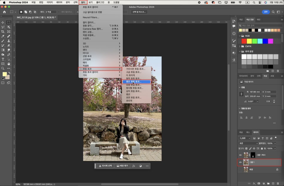 제대로 배경제거가 됐다면 원본을 선택한 상태에서 '필터 -> 흐림 효과 -> 렌즈 흐림 효과' 순으로 클릭합니다.
