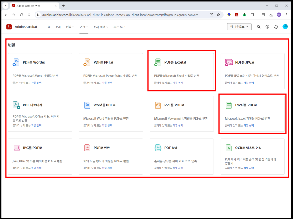 애크로뱃 온라인 페이지 상단 메뉴에서 '변환'을 클릭합니다. 여기서 Excel 외에 PPT, Word, JPG 같은 다른 포맷 형식으로도 전환할 수 있습니다.