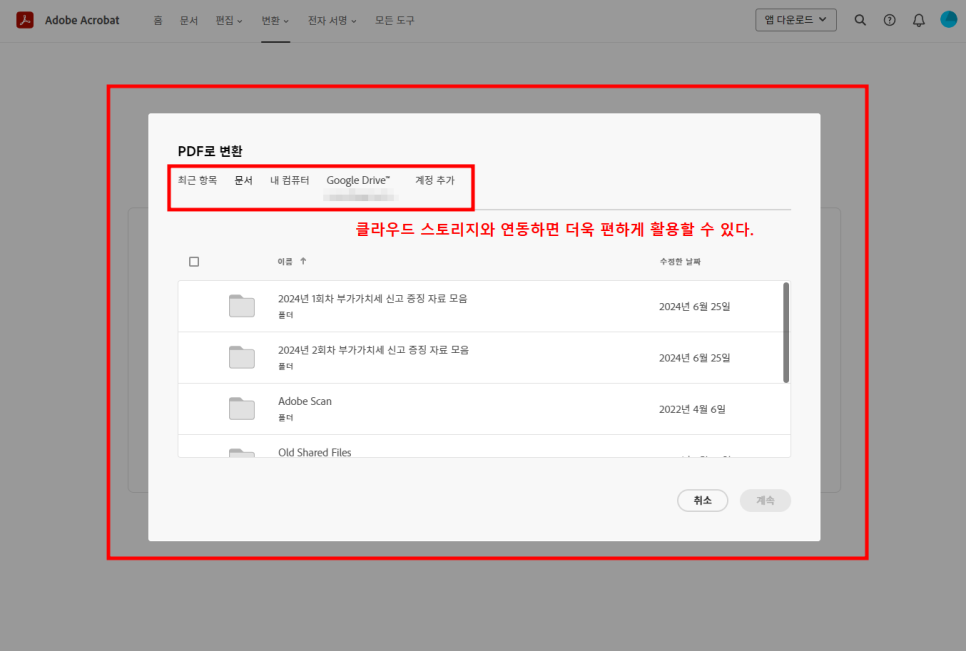 이미 애크로뱃을 구독하고 있는 중이라면 '파일 선택' 버튼을 눌러 어도비 클라우드 스토리지 또는 OneDrive / Microsoft Teams / Google Drive에 업로드 된 파일을 불러오는 것도 가능합니다.