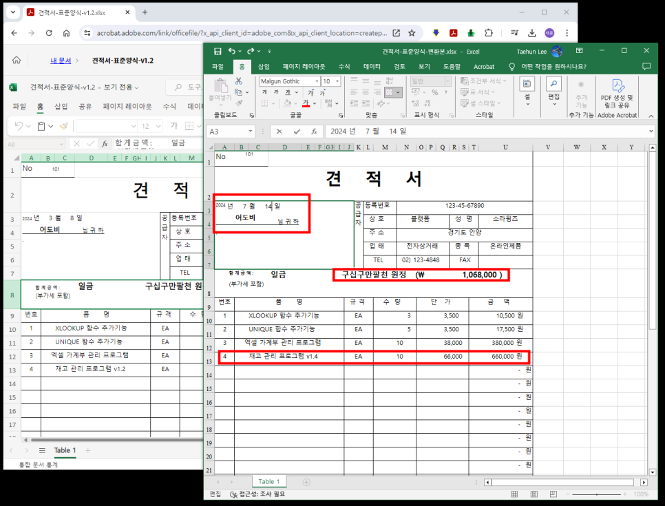 내용을 일부 수정하고 싶을 땐, 엑셀을 실행하지 않고서도 애크로뱃 온라인의 편집 모드를 실행해서 웹브라우저에서 수정할 수 있습니다. 오피스가 설치되어 있지 않는 환경에서 유용하게 쓸 수 있는 기능입니다.
