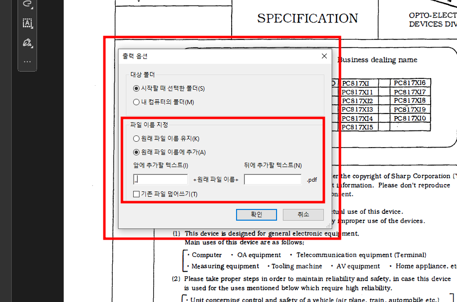 원본 문서를 덮어쓸 것인지, 다른으로 저장을 할 것인지 등도 설정할 수 있는데요. 혹시 모를 사태를 예방하는 차원에서 덮어쓰기를 하는 것보다는 '원래 파일 이름에 추가'를 선택하고 앞/뒤에 문자를 추가하여 원본 파일명과 별개의 파일명으로 저장하는 게 좋습니다.
