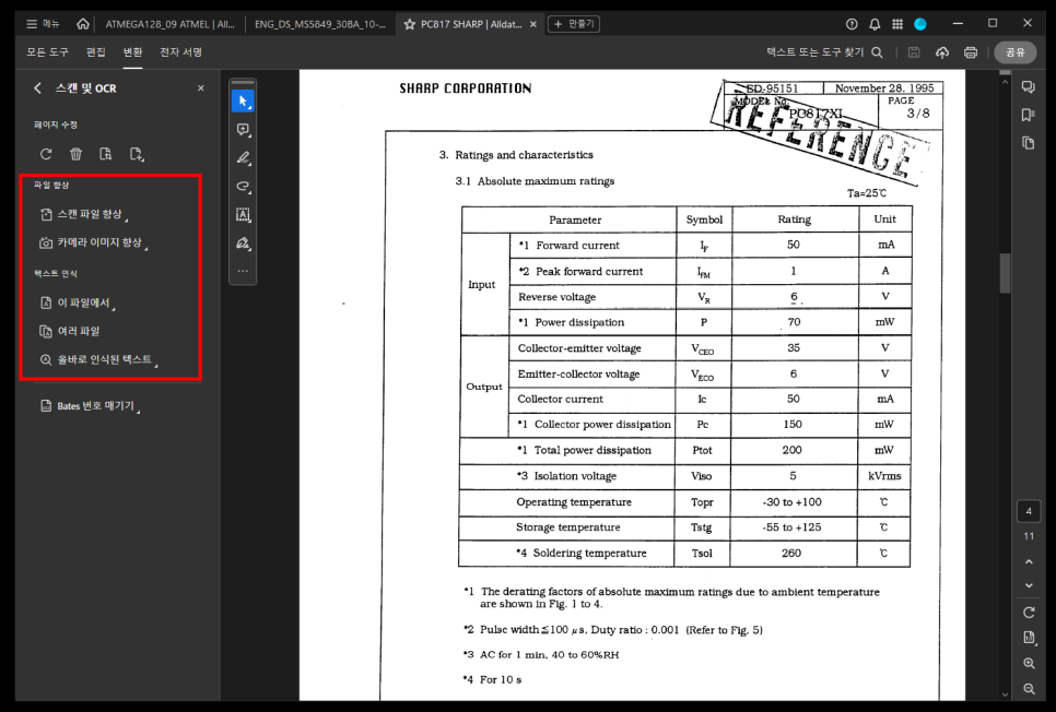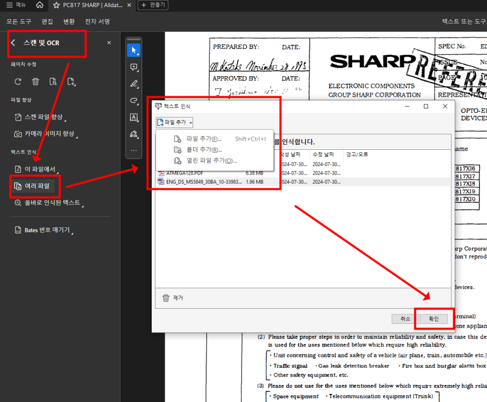 설치 후 PDF 파일을 끌어다 놓고, 상단 메뉴 중 '모든 도구' 또는 '변환' 에서 '스캔 및 OCR'을 클릭합니다.