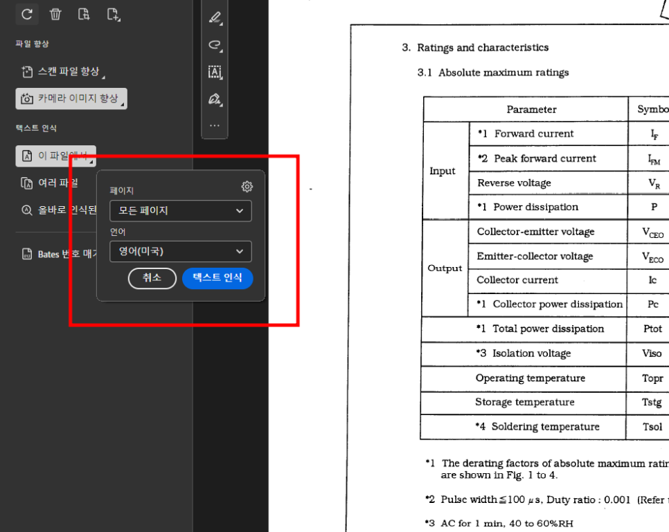 그러면 OCR 관련 기능을 볼 수 있습니다. 만약 OCR 기능을 쓰려는 문서가 페이퍼 스캔본이나 카메라로 촬영한 파일이라면 '스캔 파일 향상과 '카메라 이미지 향상' 기능으로 인식률을 높이는 게 가능합니다.