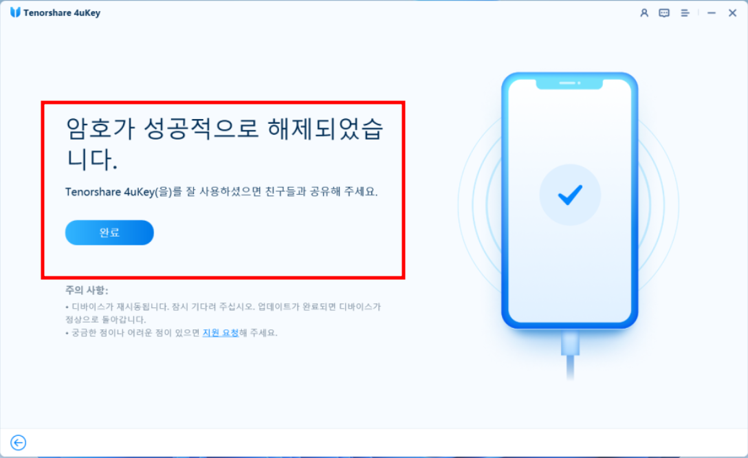 펌웨어 다운로드가 끝났으면 해제 시작 버튼을 눌러서 초기화 과정을 진행하면 되고, 이 또한 약 10 ~ 20분 정도 소요됩니다. 정상적으로 초기화가 완료되면 암호가 성공적으로 해제되었다는 메시지를 볼 수 있습니다.