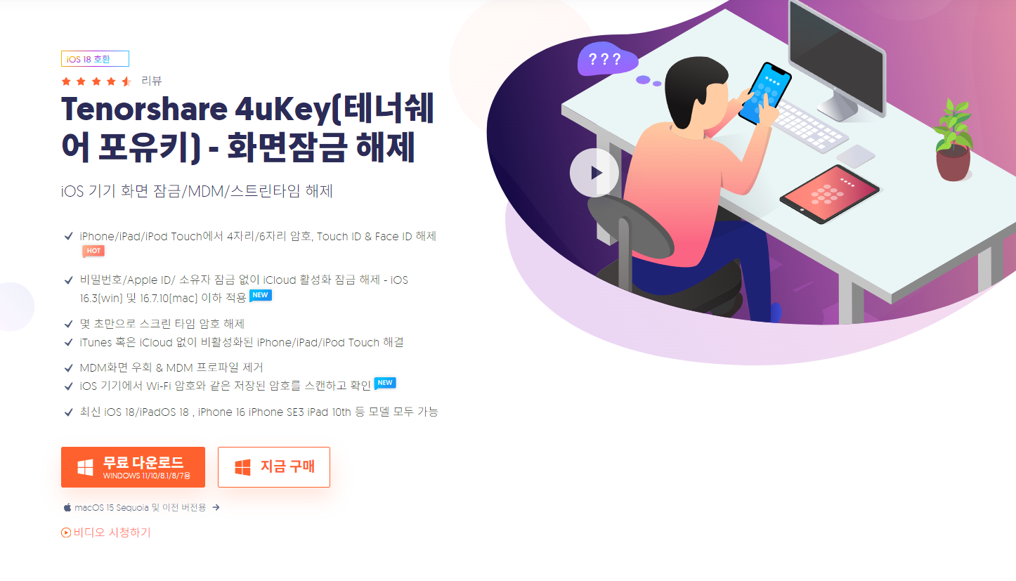그래서 오늘은 '아이폰을 사용할 수 없음?'과 같은 문제가 발생하였을 때 유용하게 쓸 수 있는 소프트웨어인 Tenorshare 4uKey for iOS (테너쉐어 포유키 포 iOS)를 소개해볼까 합니다.