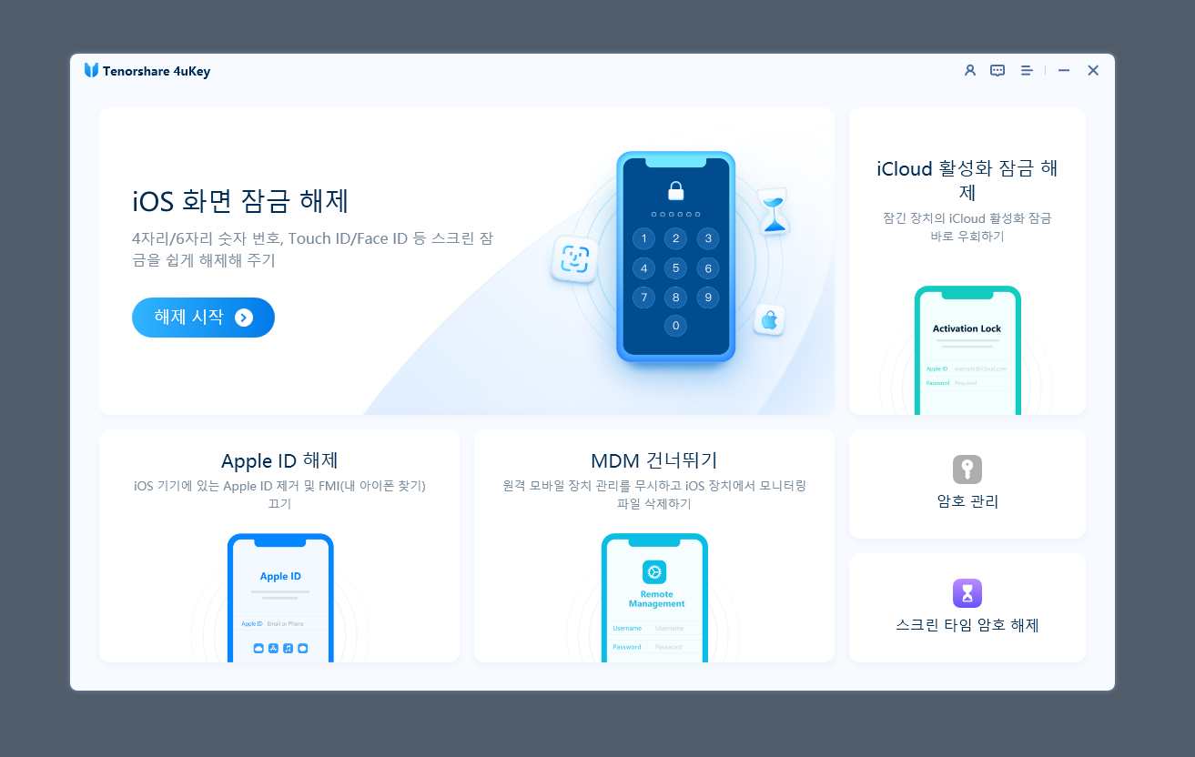 Tenorshare 4uKey for iOS로는 4자리 / 6자리 암호 및 사용자 지정 숫자 코드, 영숫자 암호, 터치 ID, 페이스 ID 등 모든 유형에 대한 암호를 수 분 이내에 해제하는 게 가능합니다.