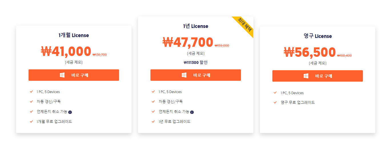 라이선스는 1개월, 1년, 영구, 3가지 플랜이 마련되어 있으며 1개월과 영구 라이선스의 가격 차이가 크지 않아 구독을 할거라면 영구 라이선스를 구독하는 게 합리적입니다.