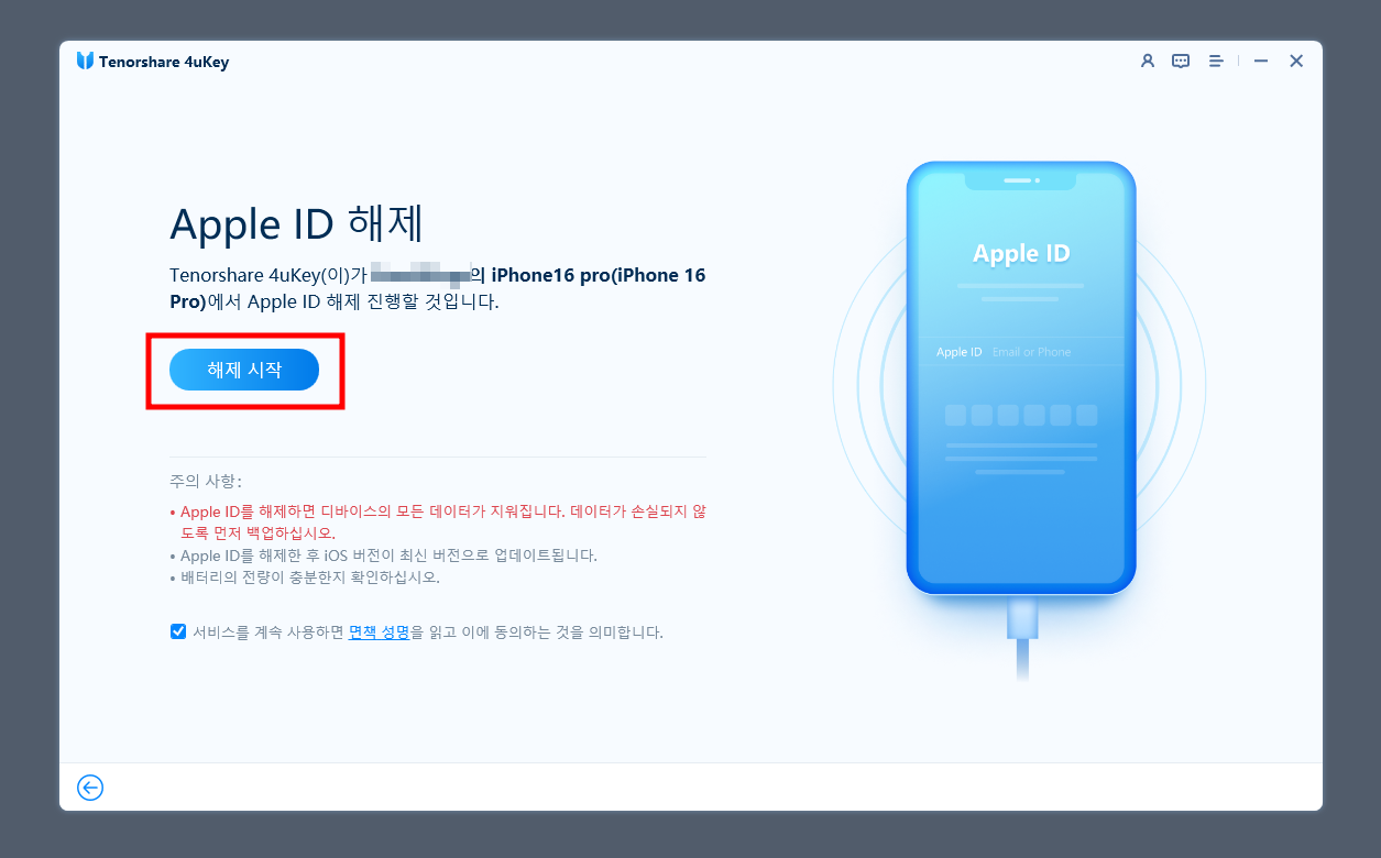 따라서 위 주의사항을 꼭 숙지하시고 데이터가 삭제되어도 괜찮다면 스마트폰을 PC에 USB 케이블로 연결하고 신뢰할 수 있는 장치로 설정 후 정상적으로 PC에서 인식이 되었다면, 메인 화면에서 'Apple ID -> 해제 시작' 순으로 버튼을 눌러 다음 단계를 진행하시길 바랍니다.