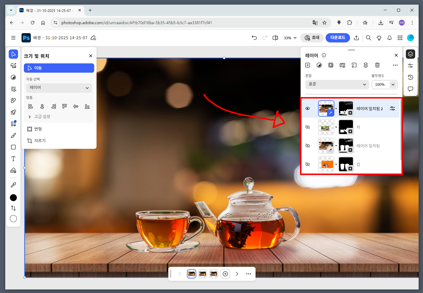 만약 가게 상품을 홍보하는거라 배경은 그대로 놔두고 음료만 다른 이미지로 바꾸고 싶다면, 매번 새로 만들 필요 없이 새로운 음료 이미지를 추가하고, 기존에 있는 음료 이미지는 레이어 패널에서 눈 모양 아이콘을 눌러 숨겨주면 됩니다.