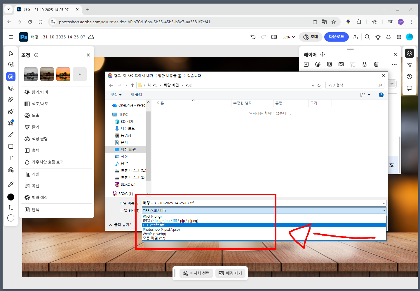 그리고 PSD, JPEG, PNG, WebP, TIFF 등의 다양한 포맷 형식 중 원하는 형식을 선택해서 저장할 수 있습니다.
