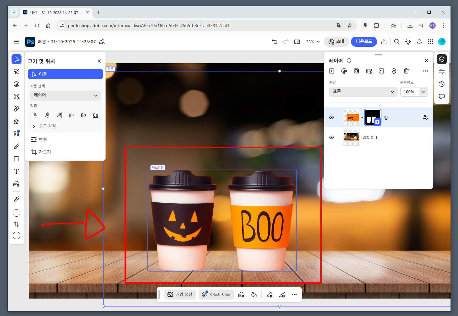 불러 온 음료 컵 이미지를 보면 배경색 포함되어 있기 때문에 합성을 하려면 누끼따기가 필요합니다. 음료 컵이 있는 레이어를 선택 후 하단 상황별 작업 표시줄에서 [배경 제거]를 클릭해서 누끼따기를 완료합니다.