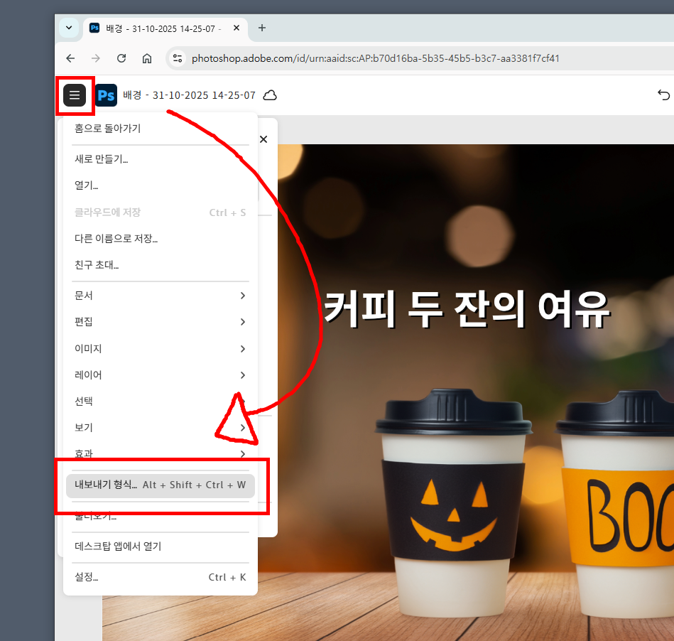 PSD 파일 편집이 끝났으면 좌측 상단에 [주 메뉴] 버튼을 누르고 [내보내기 형식] -> [내 컴퓨터에서]를 클릭합니다.