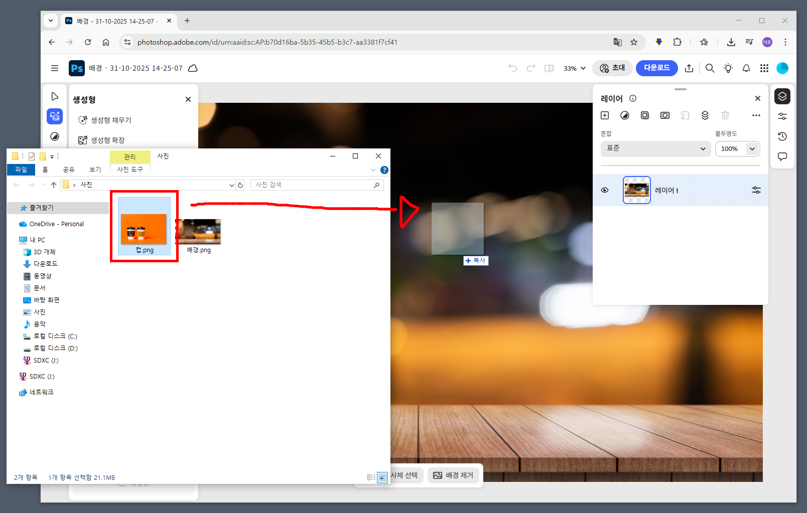 저는 카페 테이블 위에 음료 컵을 합성해보기 위해 먼저 카페 배경 이미지를 불러왔습니다. 캔버스가 열렸으면 이번에는 음료 컵 이미지를 캔버스 위로 끌어다 놓아서 열어줍니다.